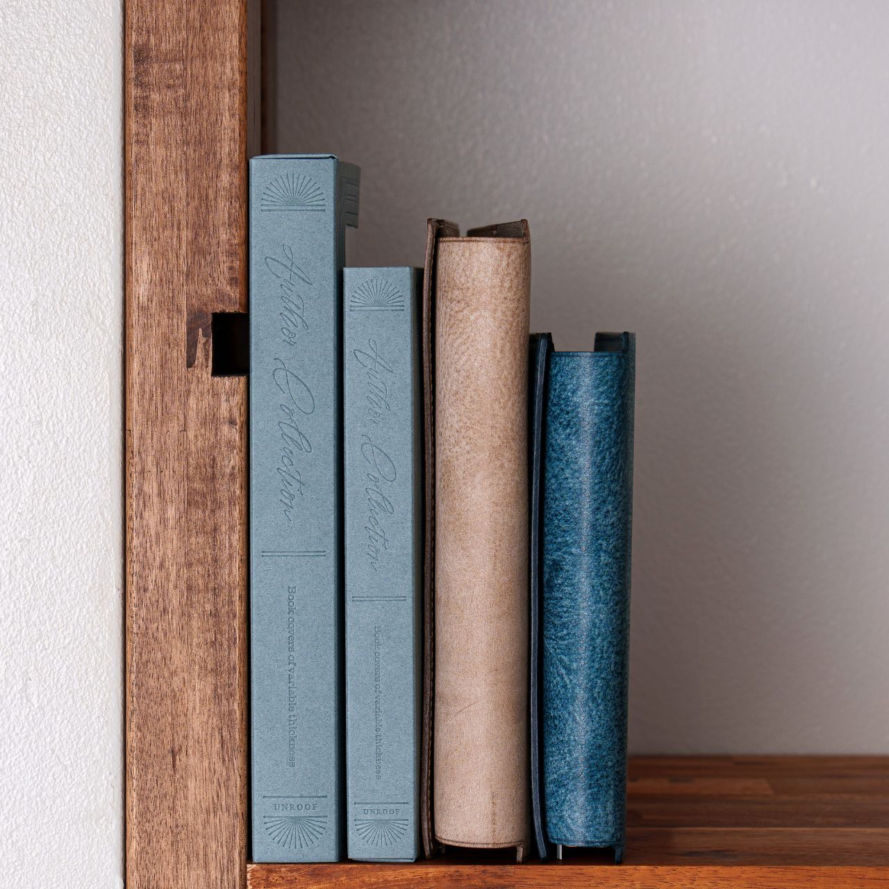 100頁から1,000頁越えのあらゆる本の厚みに対応する『厚みが調整できる』本革のブックカバー。厚みが異なる神永氏の書籍も、本それぞれの厚みに応じてしっかりと包むことが可能です。