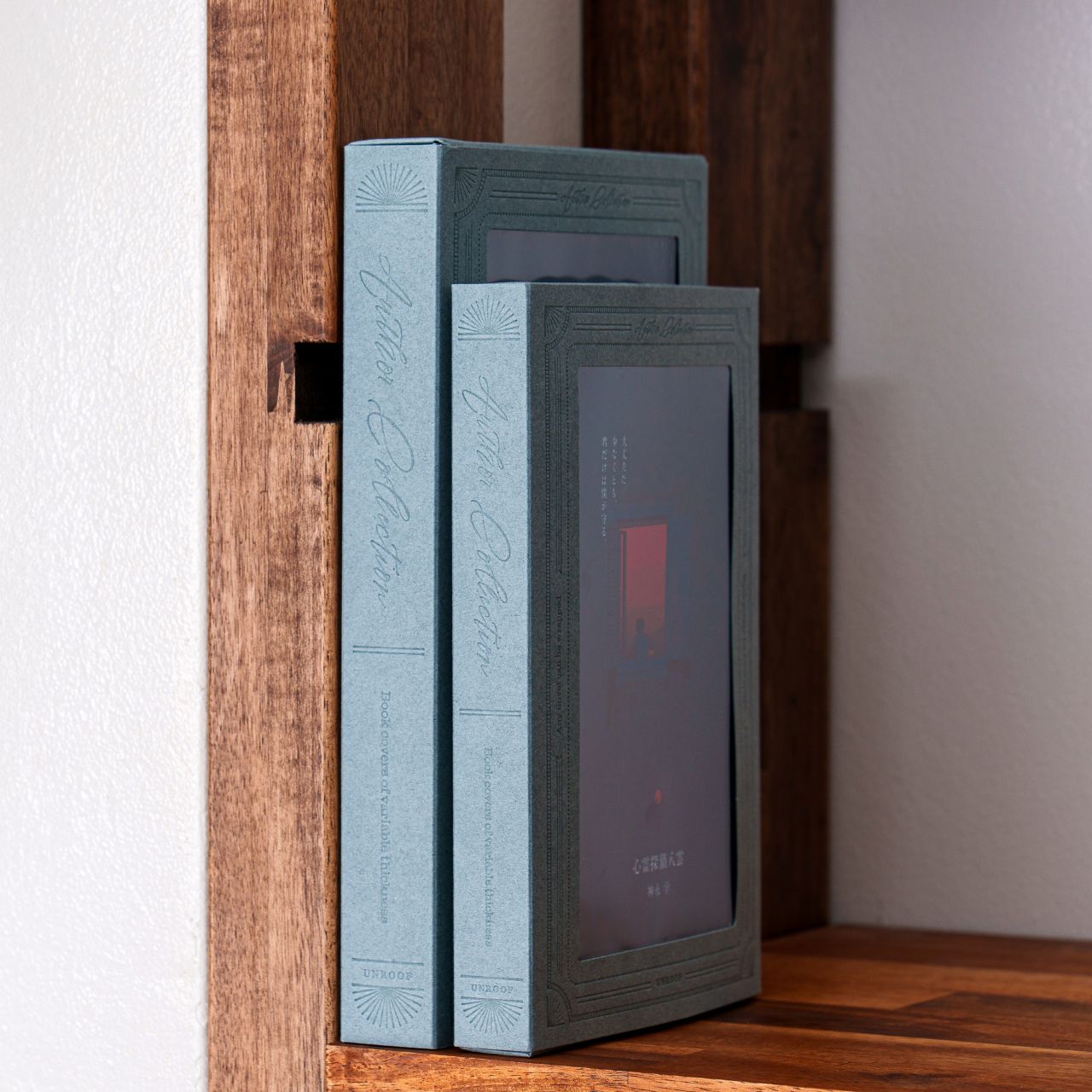 活版印刷で額縁をイメージしたブックケース。日本で半世紀以上続く老舗の活版印刷企業にて仕立てていただいただきました。活版印刷ならではの独特の凹凸感が伝える、人の手のぬくもりをぜひお楽しみください。