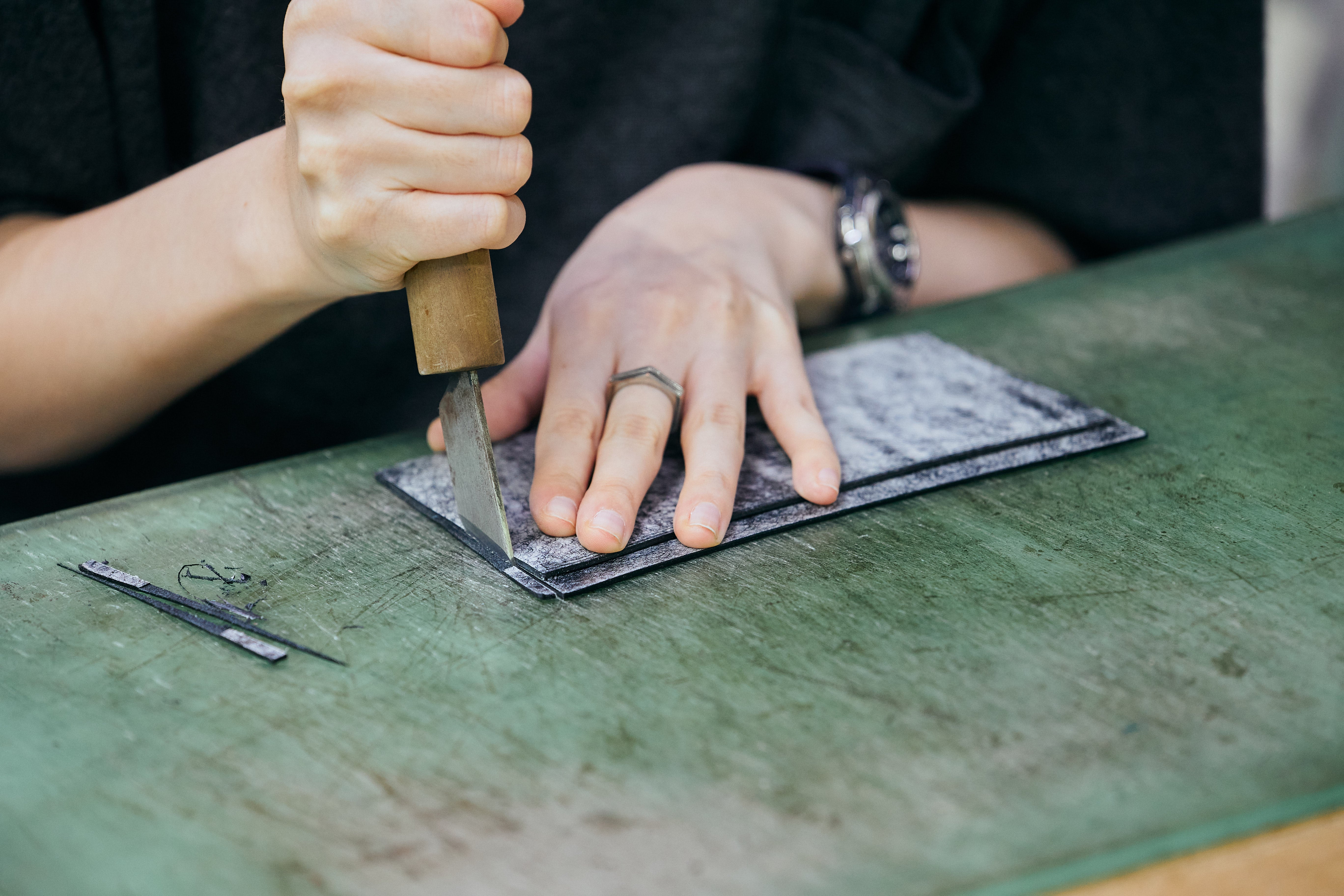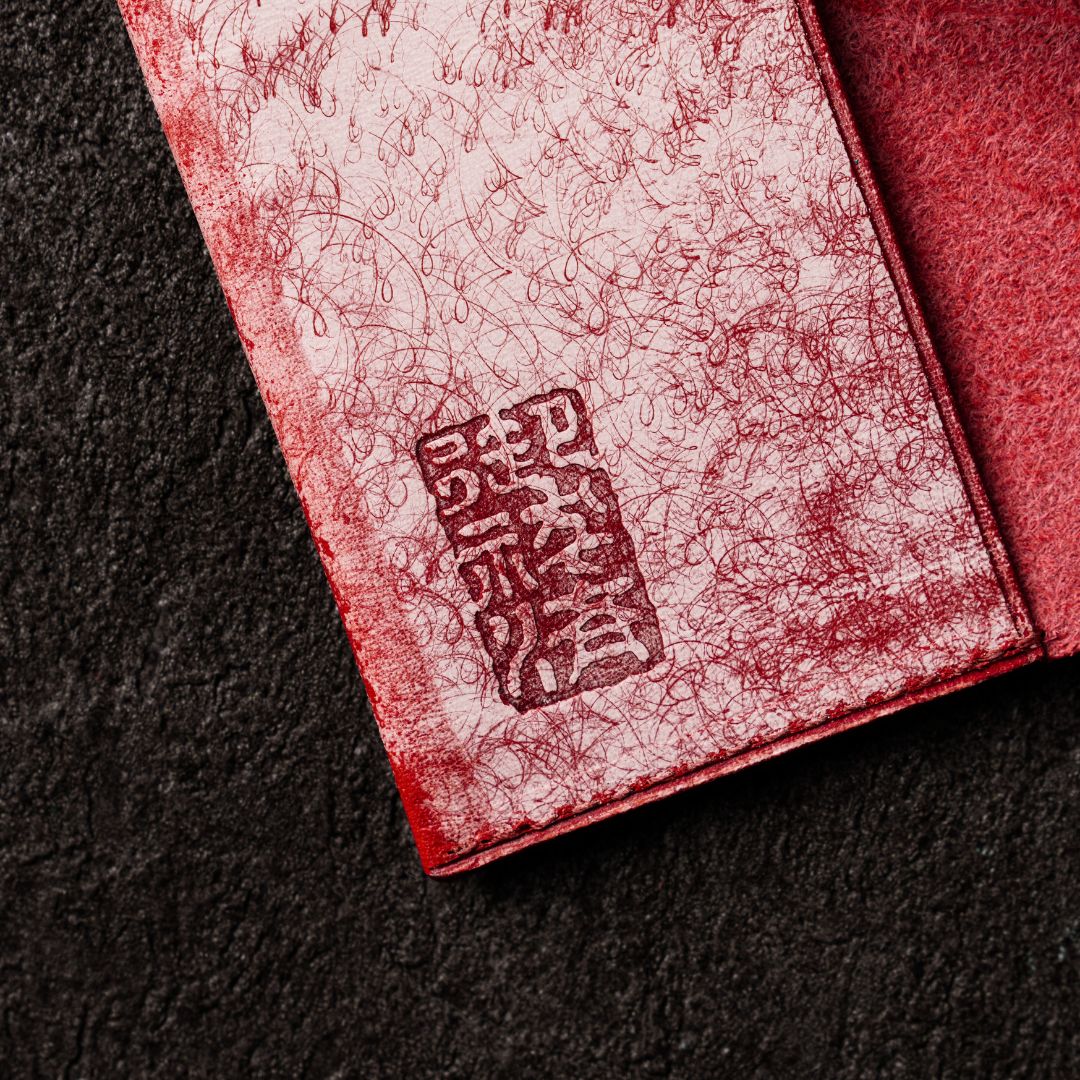 京極氏のサインと共に登場することも多い「御祓済」の落款。この「御祓済」刻印をブックカバー内側に施しています。