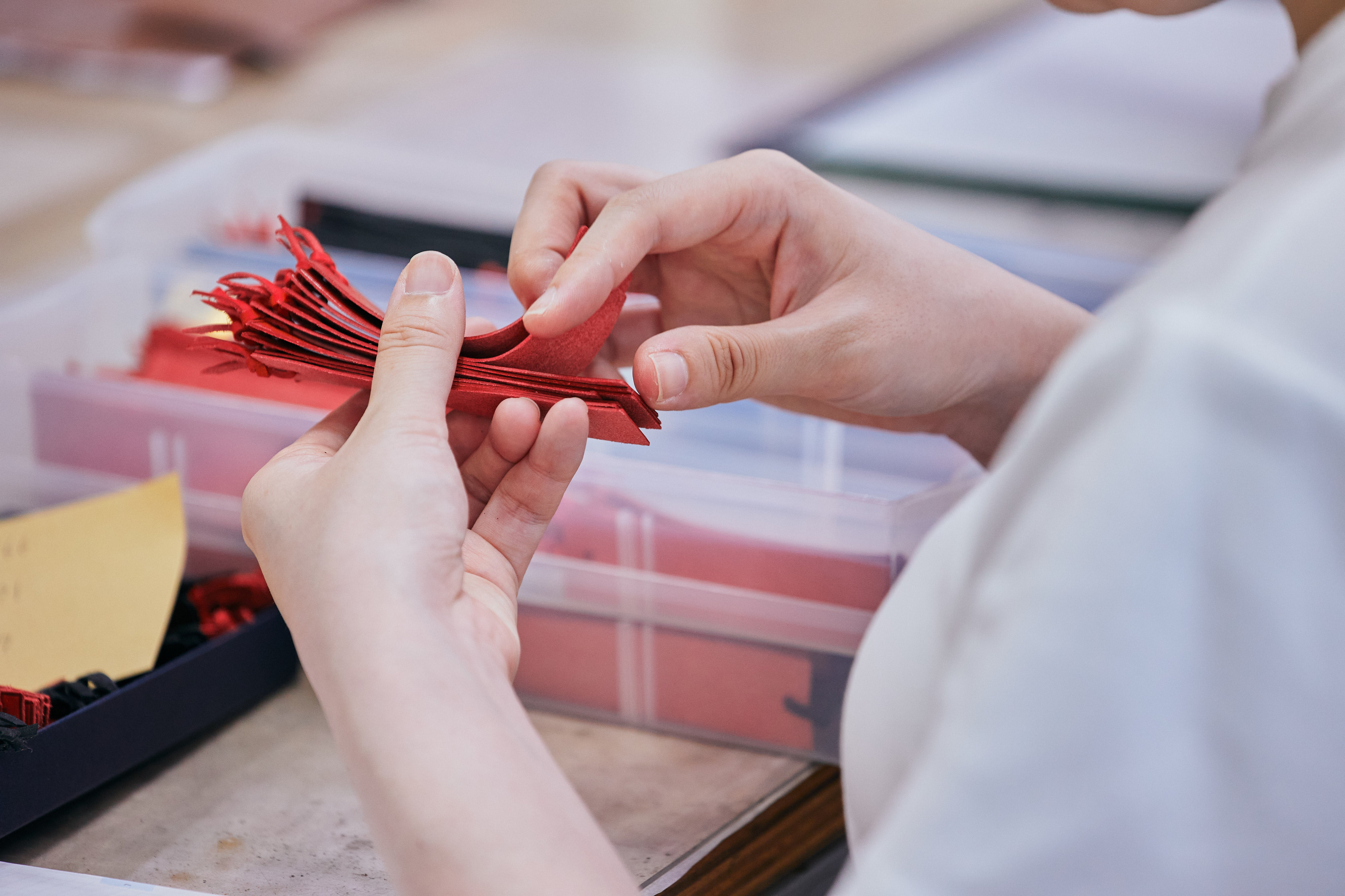 オリジナルブックカバーと同じレザーで仕立てた本革しおり。本体カラーと同じ色で仕立てたしおりがセットとして付いています。革紐は赤で統一し、しおり単体でも世界観を演出。