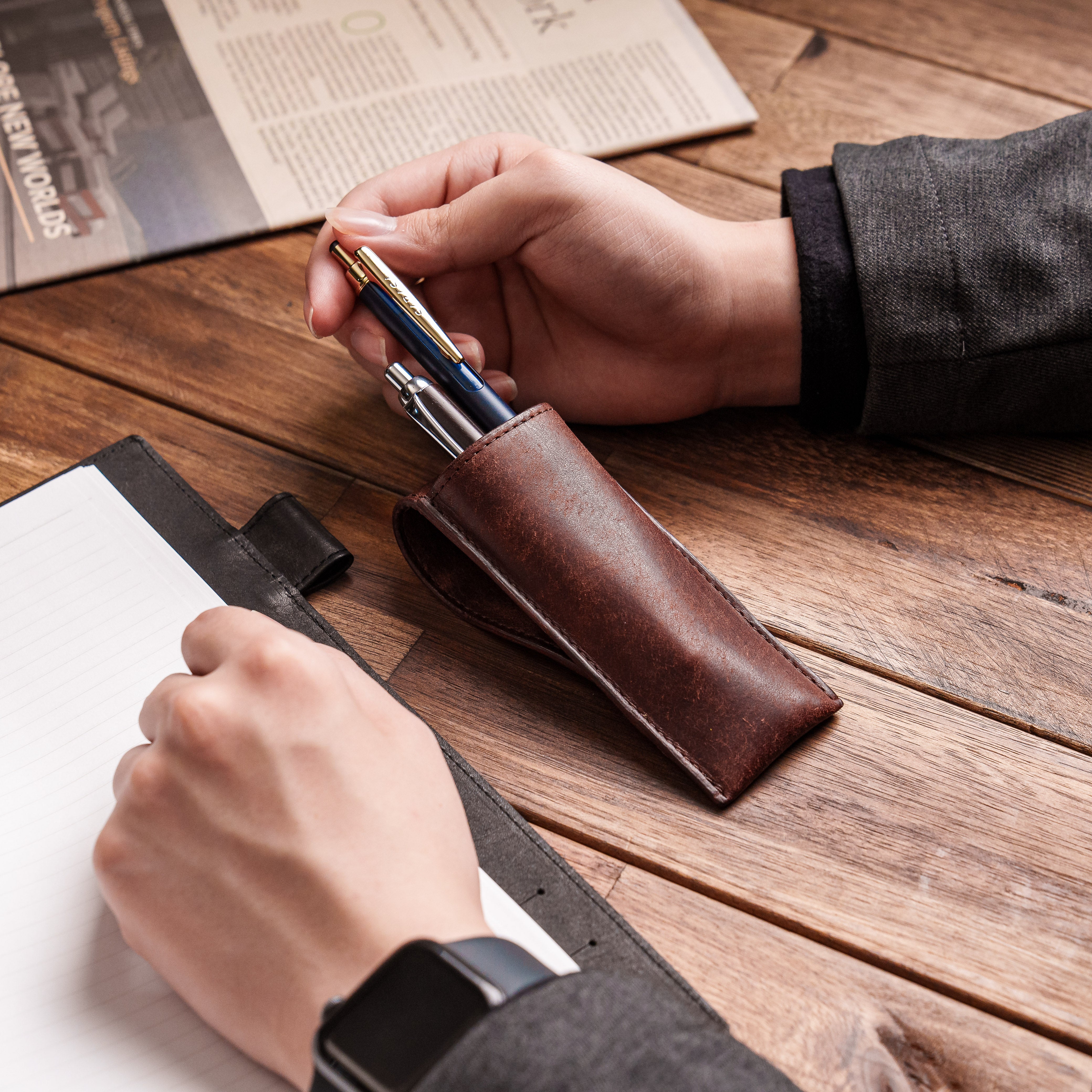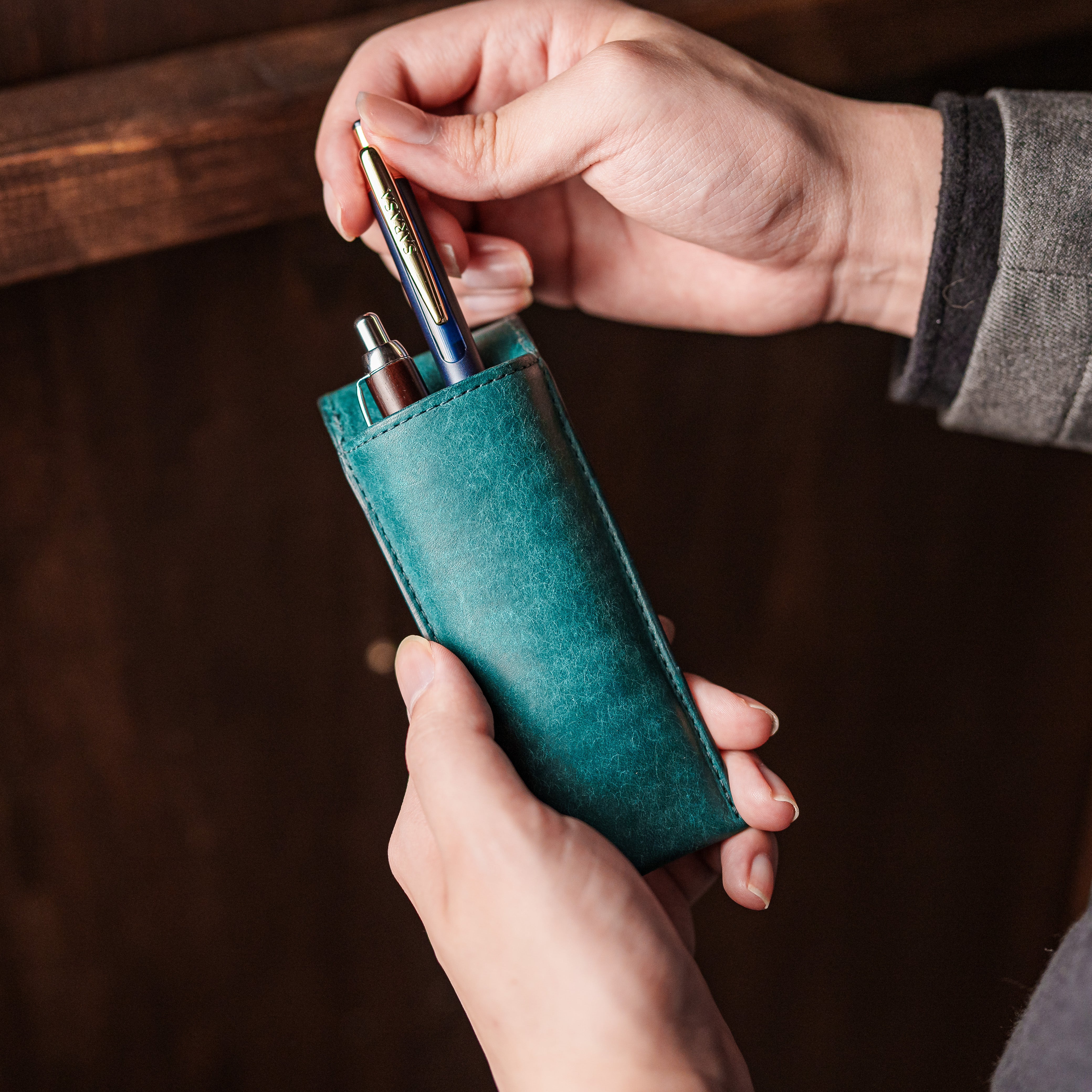 ペンケースからそっと差し出されたペンは、デスク上でも美しく、また取り出しやすい利点があります。