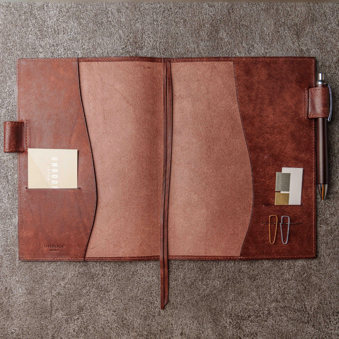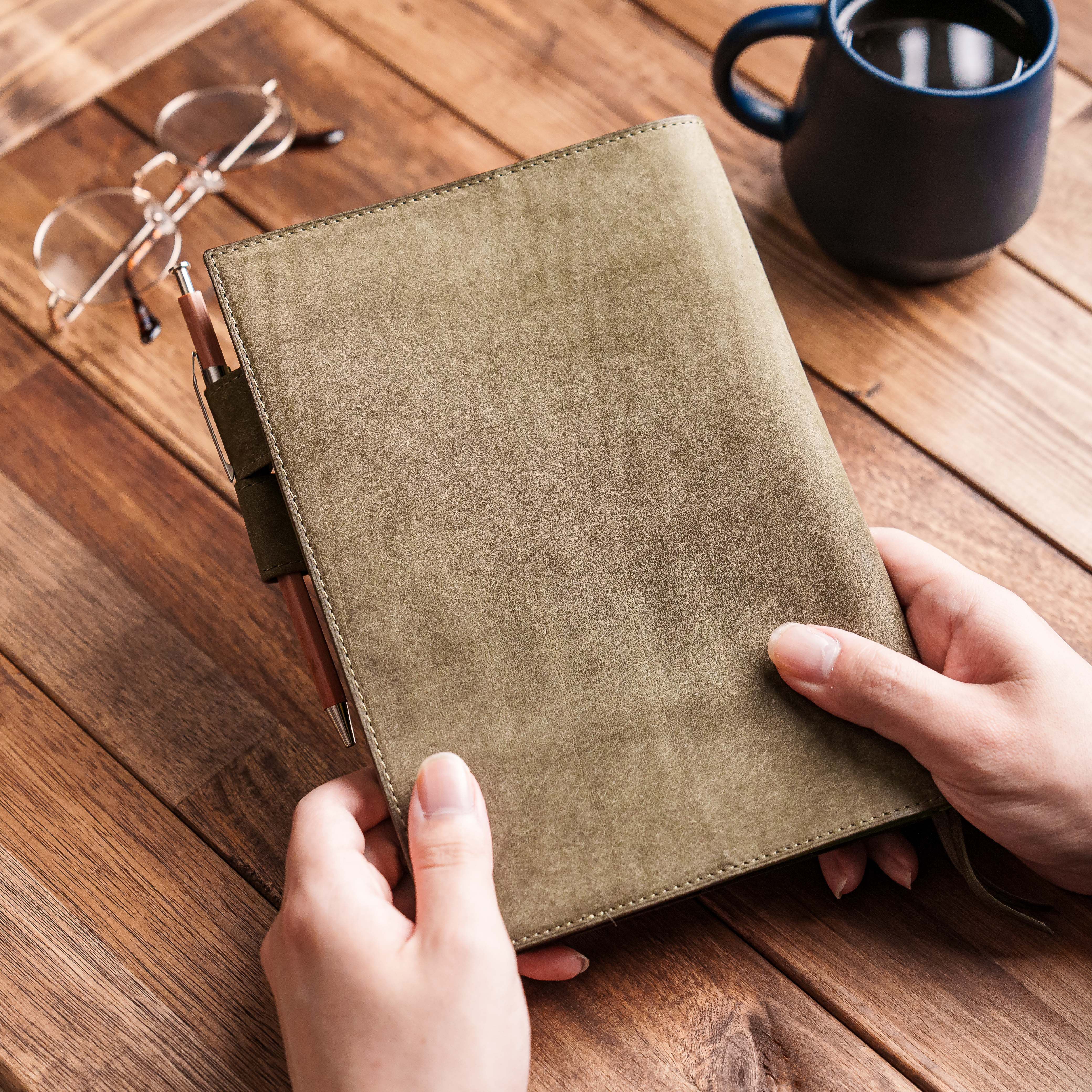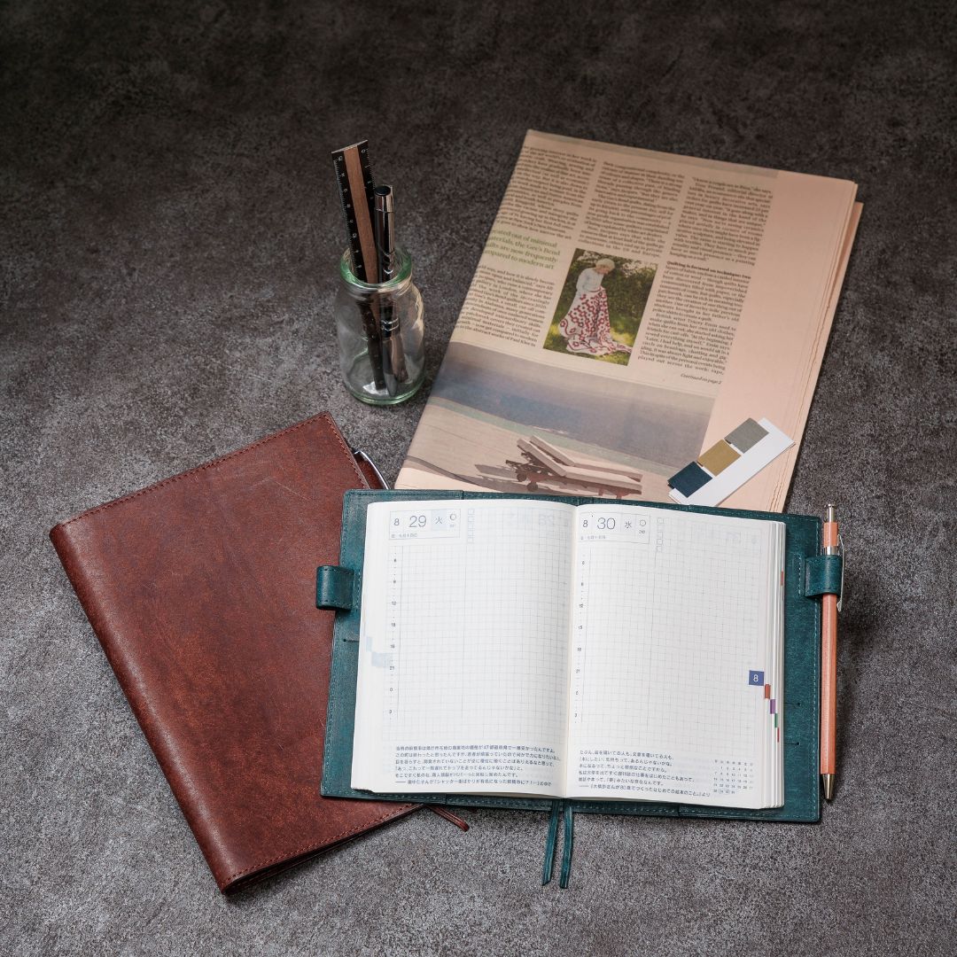 A6サイズ/A5サイズの2サイズを展開。手帳やノートの厚みは1.5cmまで対応しているため、ノートを2冊収納して使うことも可能です。