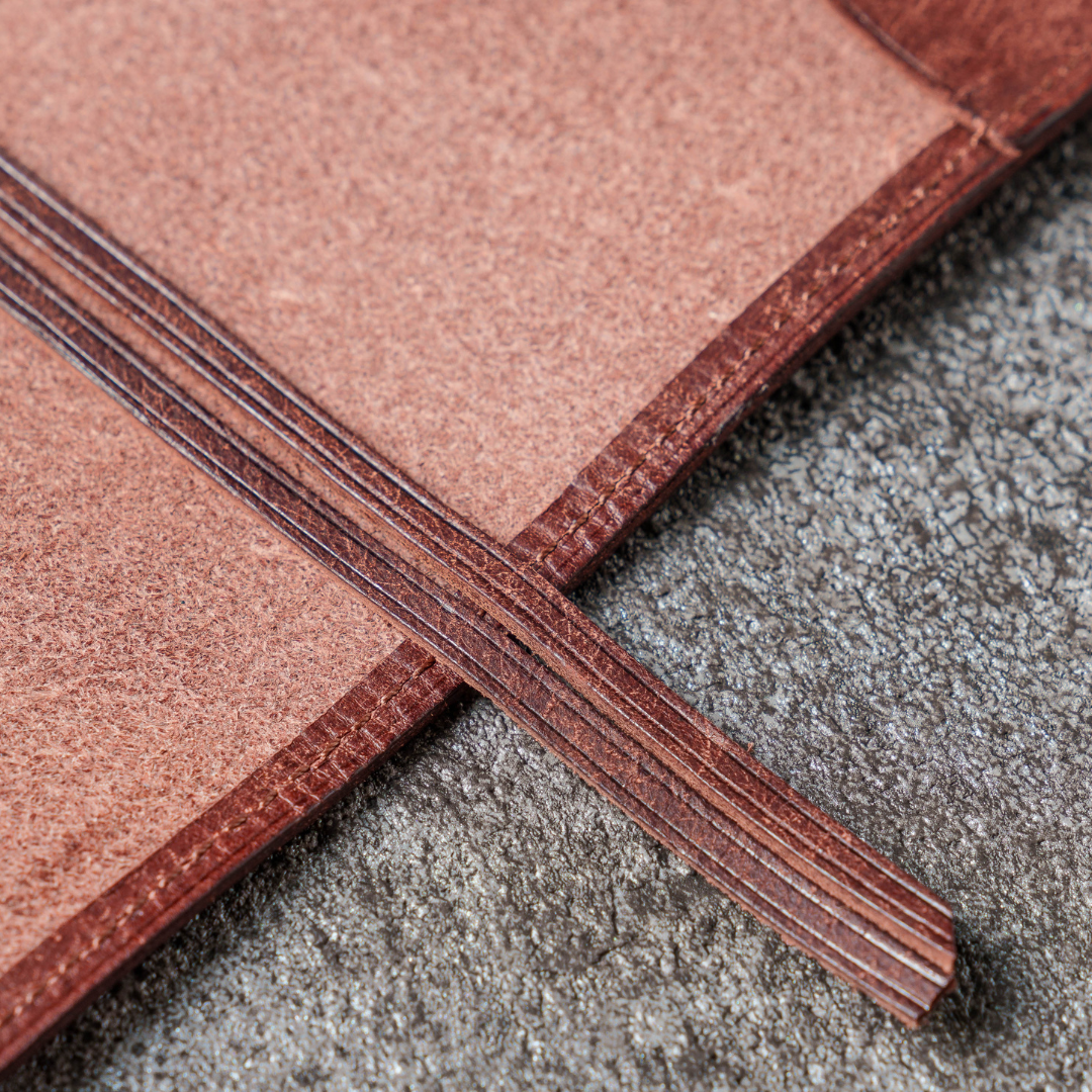 表と同じプエブロレザーで仕立てた付属の本革しおり2本。しおりの紐をよく見ていただくと、内側に細い線があります。